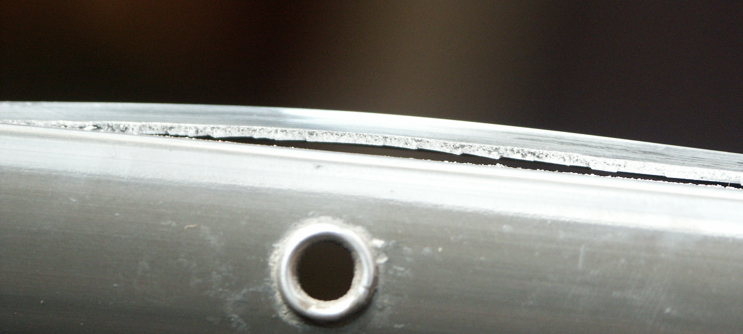 Felgentod: Vorderrad, 38 MmSchon etwa seit einem Jahr bremst es ungleichmäßig am Vorderrad. Ich vermutete das die Felge, eine Alesa Explorer 406-17, auch mal wieder durchgebremst sei und sich die Felgenhörner nach aussen biegen. So richtig zu erkennen war das aber nicht, nur zu lokalisieren war es im Bereich des Ventils. Auch das korrigieren mit der Wasserpumpenzange gelangt nicht, die Felge gab an der Stelle erstaunlich elastisch nach.