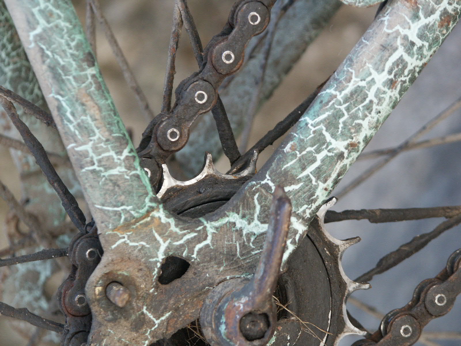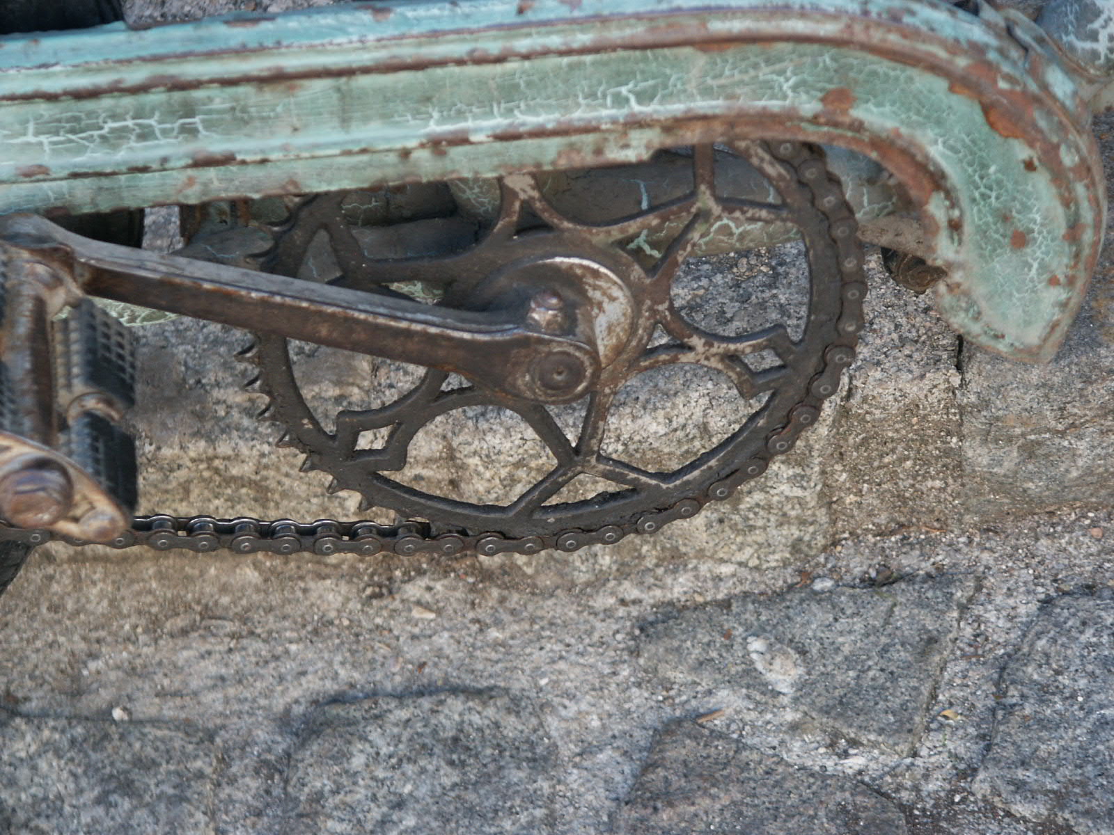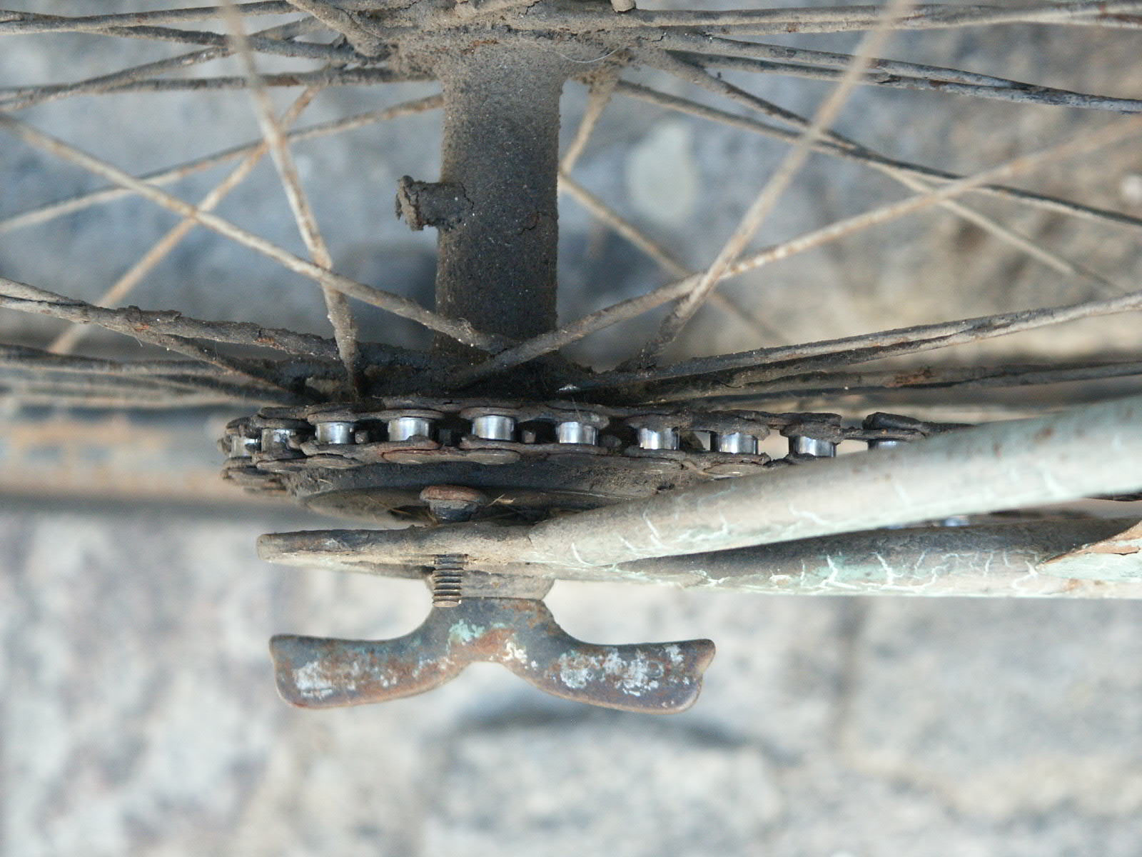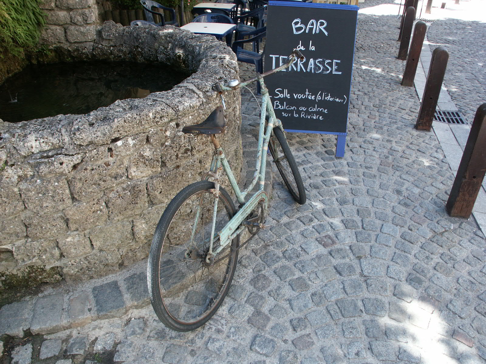 In Meyrueis fand ich dieses benutzte, ältere Fahrrad am Brunnen lehnend. Singlespeed, Ratlook, oder klassisch ausgedrückt: benutzt. Ich schätze seit etwa 40 Jahren. Als Pflege kam vieleicht gelegentlich etwa Öl an die Kette. Nach dem Bild 5 zu urteilen ist es noch kein vélo à